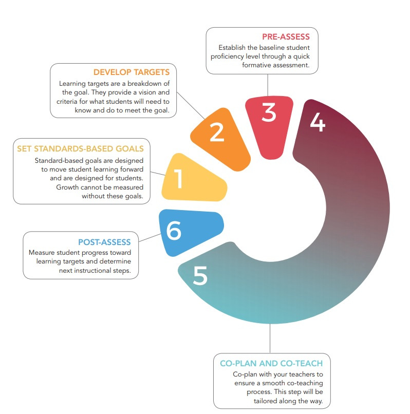 The coach and teacher articulate what they hope the students will learn as a result of their partnership. Choosing a goal that begins with, “Students will…” ensures that we are student-centered. Goals may focus on the standards, student engagement, or behavior.